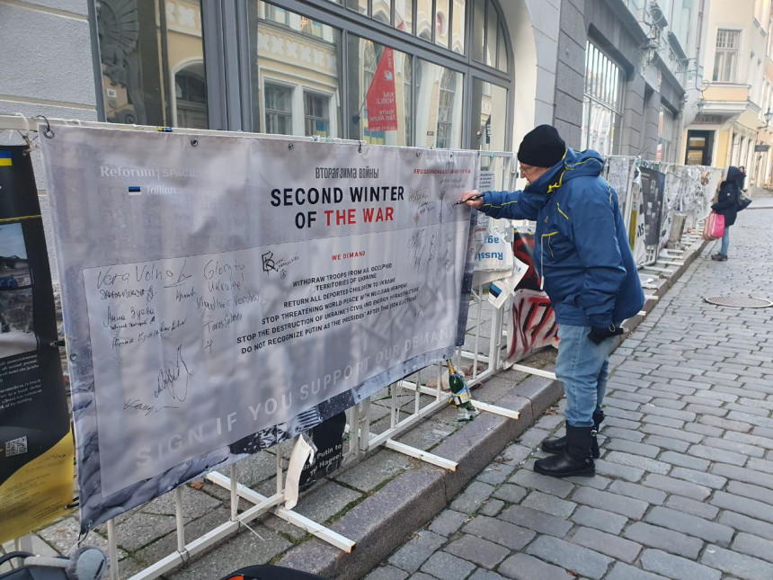 Одна из организаторов акции, резидент Reforum Space Tallinn Сана Безменова говорила не только об Украине, но и о России. Там с каждым днем увеличивается количество политзаключенных — людей, которые получают сталинские сроки в пять, семь, двенадцать лет колонии за антивоенную позицию. Она напомнила о недавнем приговоре художнице Саше Скочиленко, которую приговорили к семи годам колонии за то, что она разместила маленькие листовки с информацией о войне в магазине — в апреле 2022 года.